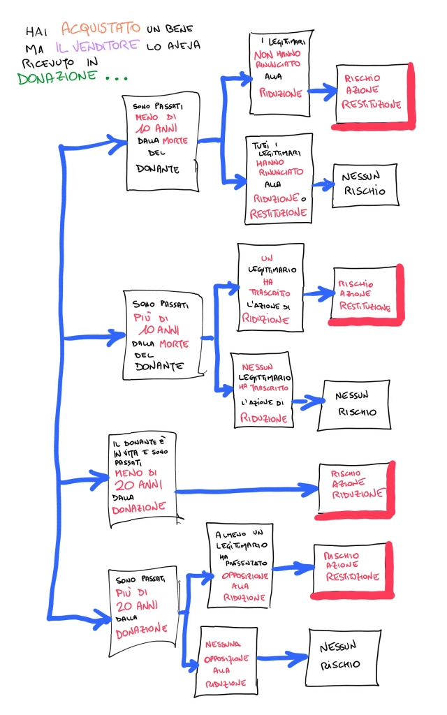 il tema della RIDUZIONE / RESTITUZIONE va considerato anche da un altro punto di vista. Devi comprare casa ? E' necessario sincerarsi che la casa che ti accingi ad acquistare non sia stata oggetto di una DONAZIONE. In tal caso si rende necessario conoscere dettagli quale la data di trascrizione dell'atto, occorre sapere se il donante è in vita, occorre essere al corrente di eventuali rinunce alla RIDUZIONE, se è intervenuta una SOSPENSIONE ...
